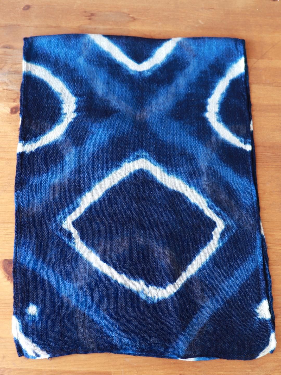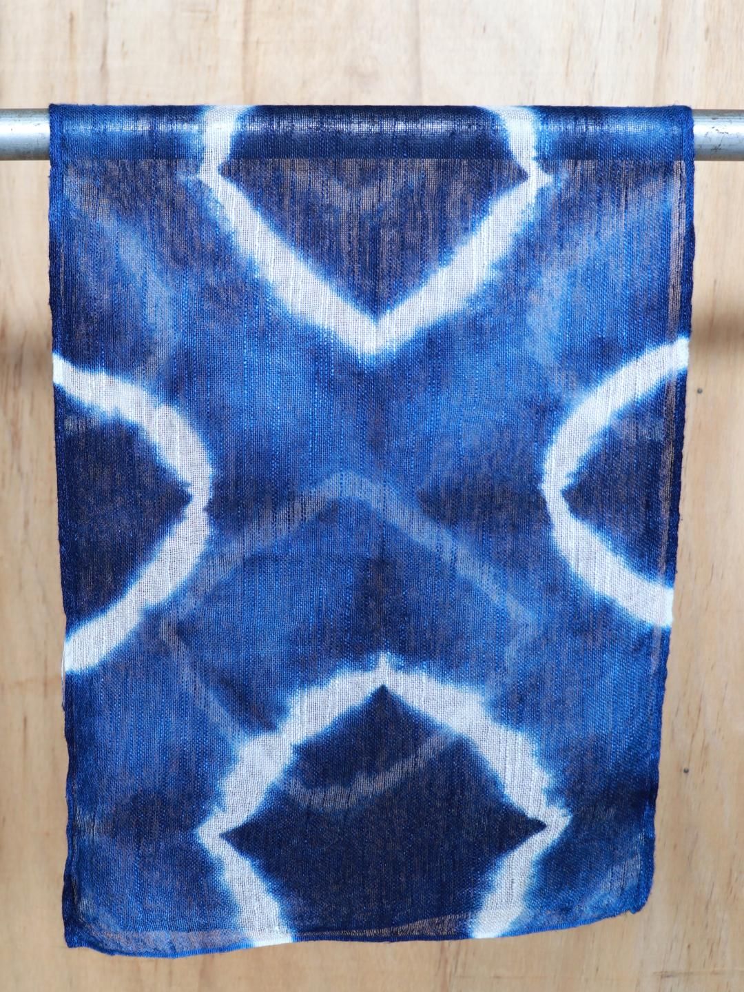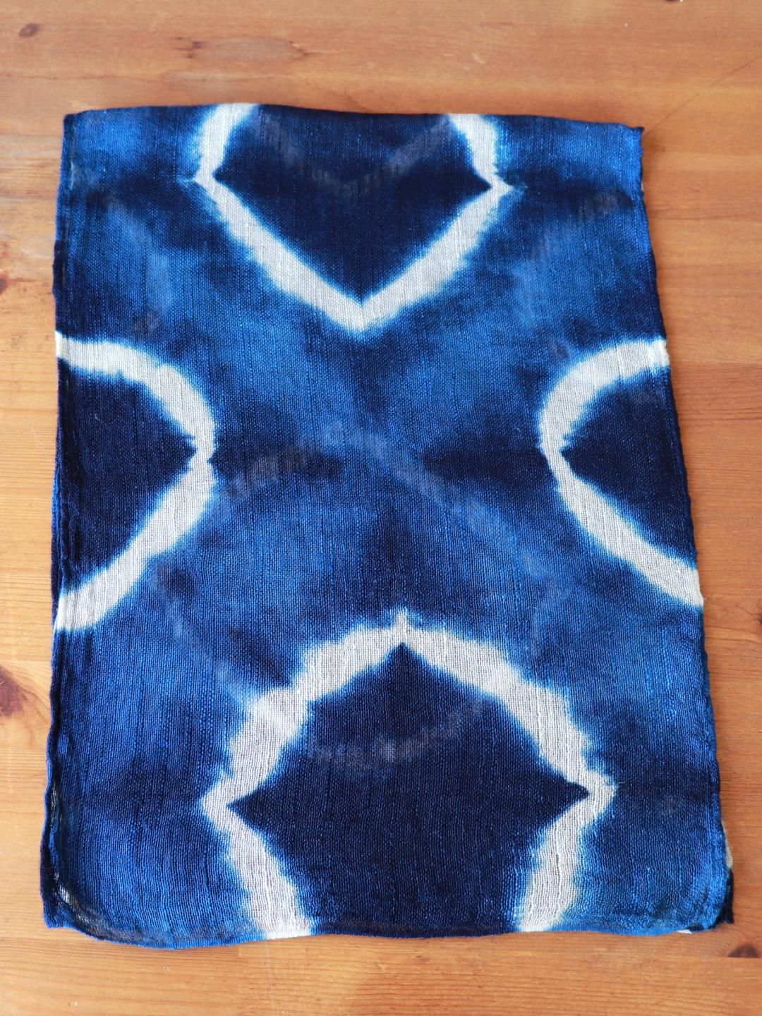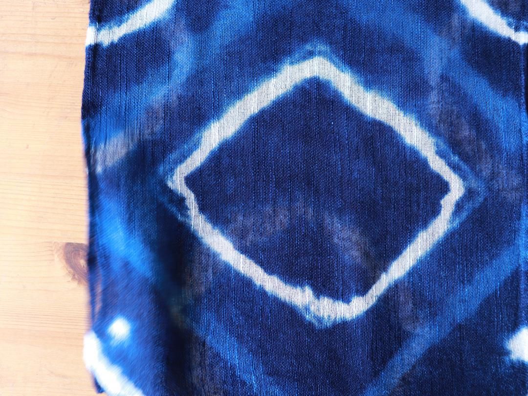 藍染めならではの深い青に、菱形の絞り模様が大胆に映えるデザインです。