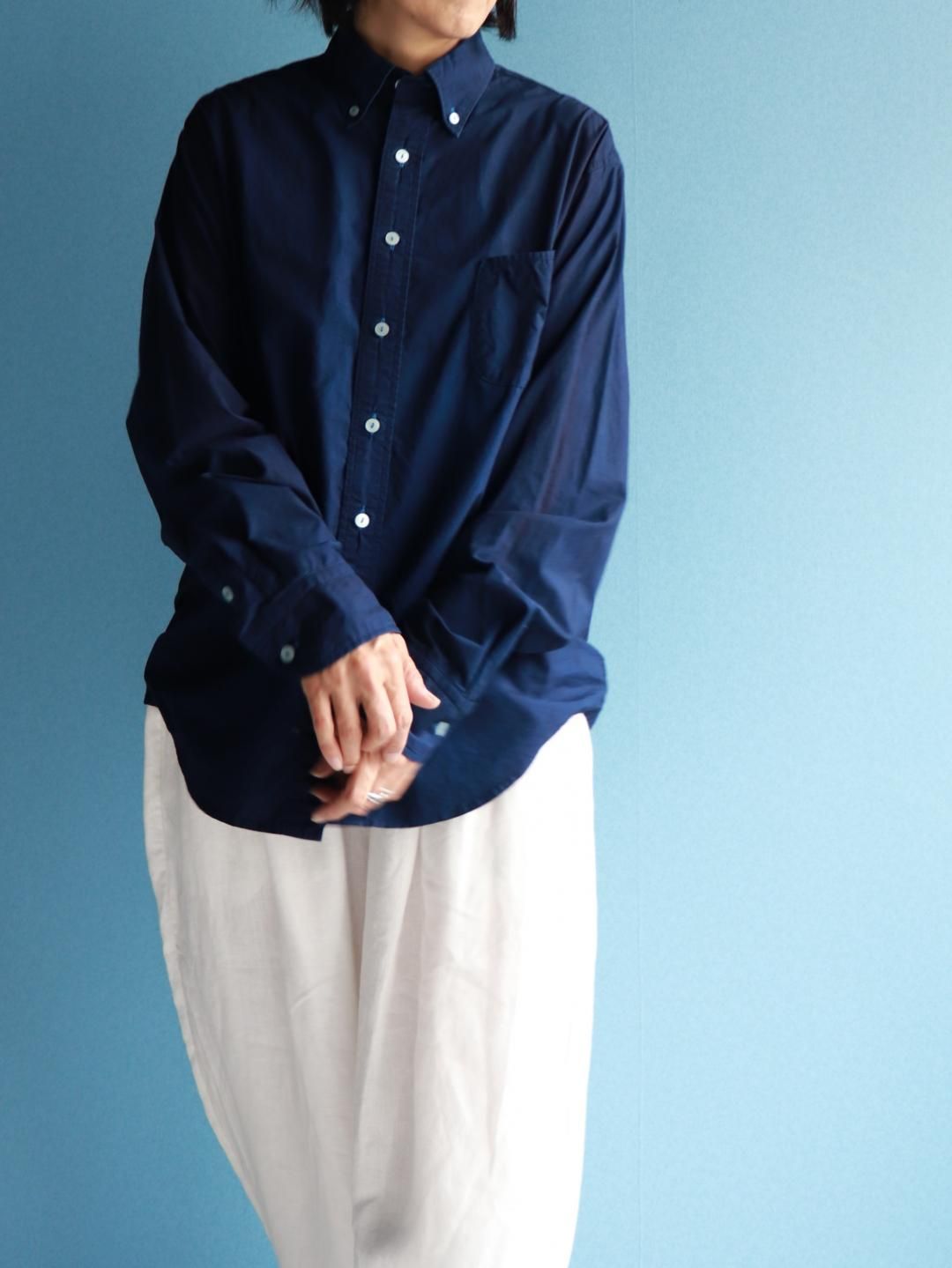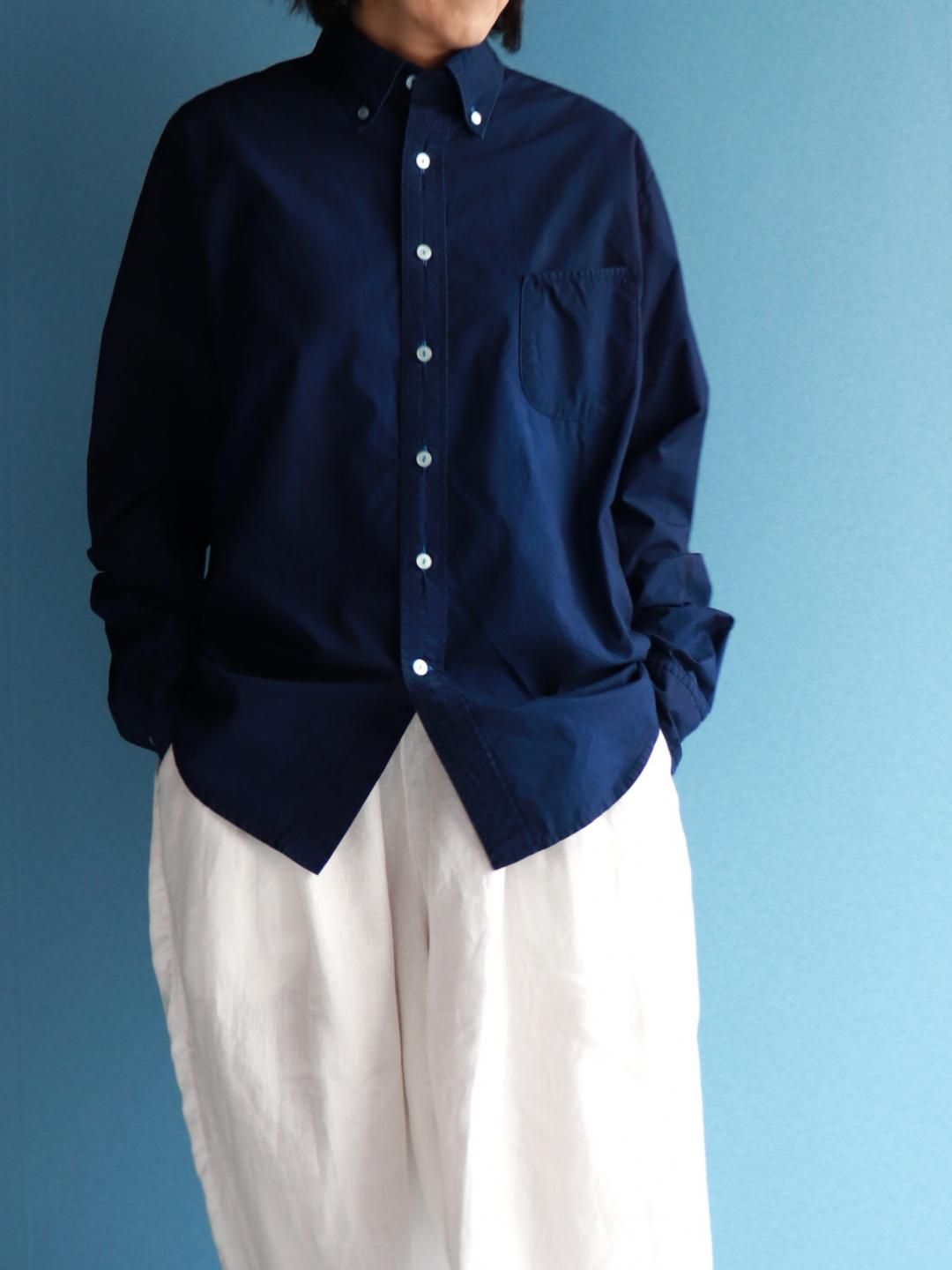 インディゴの深い色合いが映えるボタンダウンシャツ。