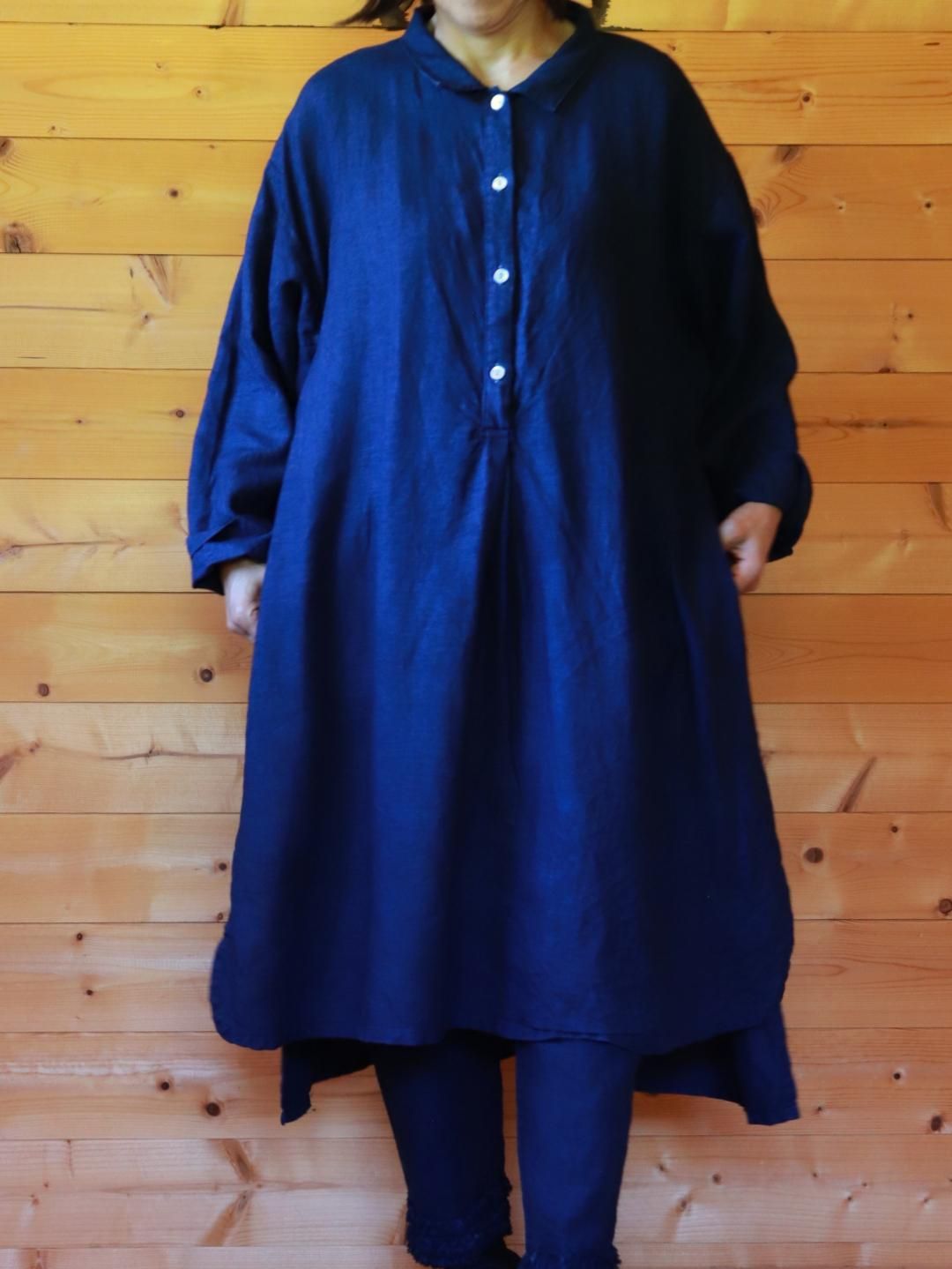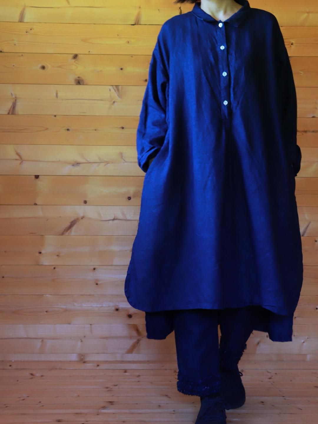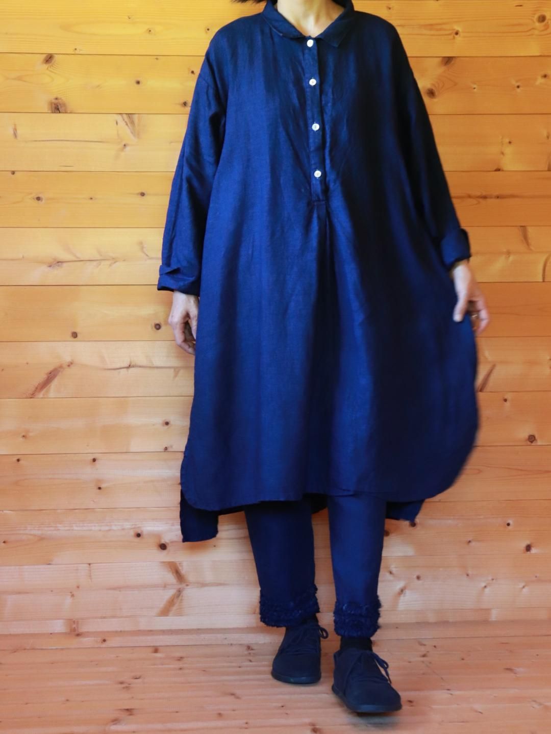 2025年秋冬の新作、インディゴブルーの前タックチュニック。